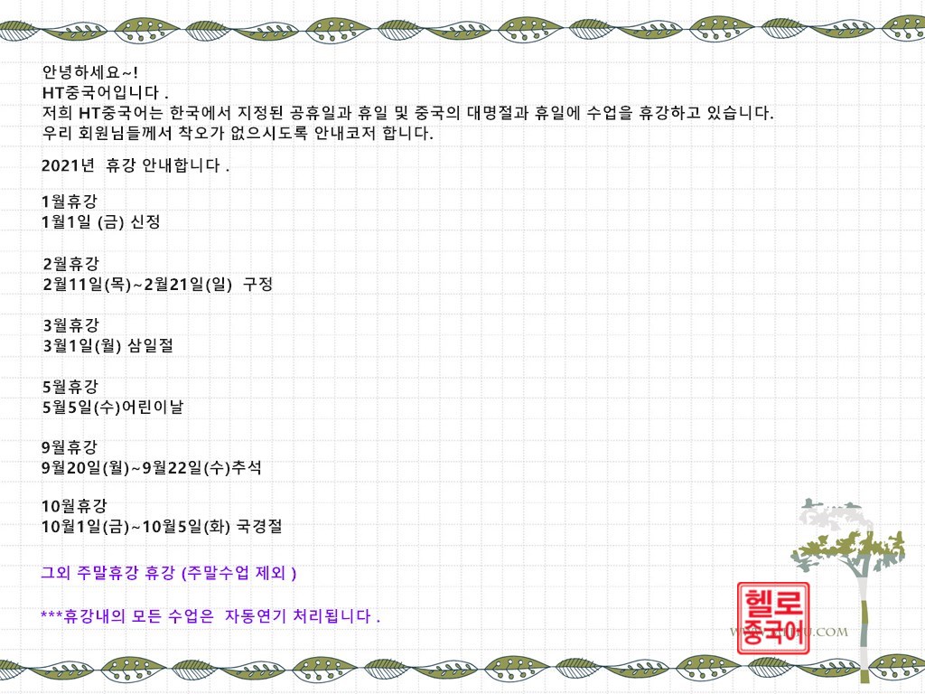 2021년 헬로중국어 휴강안내합니다