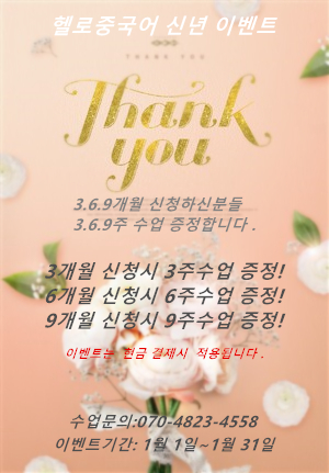 안녕하세요 헬로중국어입니다^^2021년 신년을 맞아 저희 헬로중국어는 다음과같은 이벤트 진행합니다 3.6.9.이벤트 3개월신청시 +3주 6개월신청시 +6주 9개월시청시 +9주 *이벤트는 현금결제입니다 .新年快乐!万事大吉!合家欢乐!财源广进!事事如心