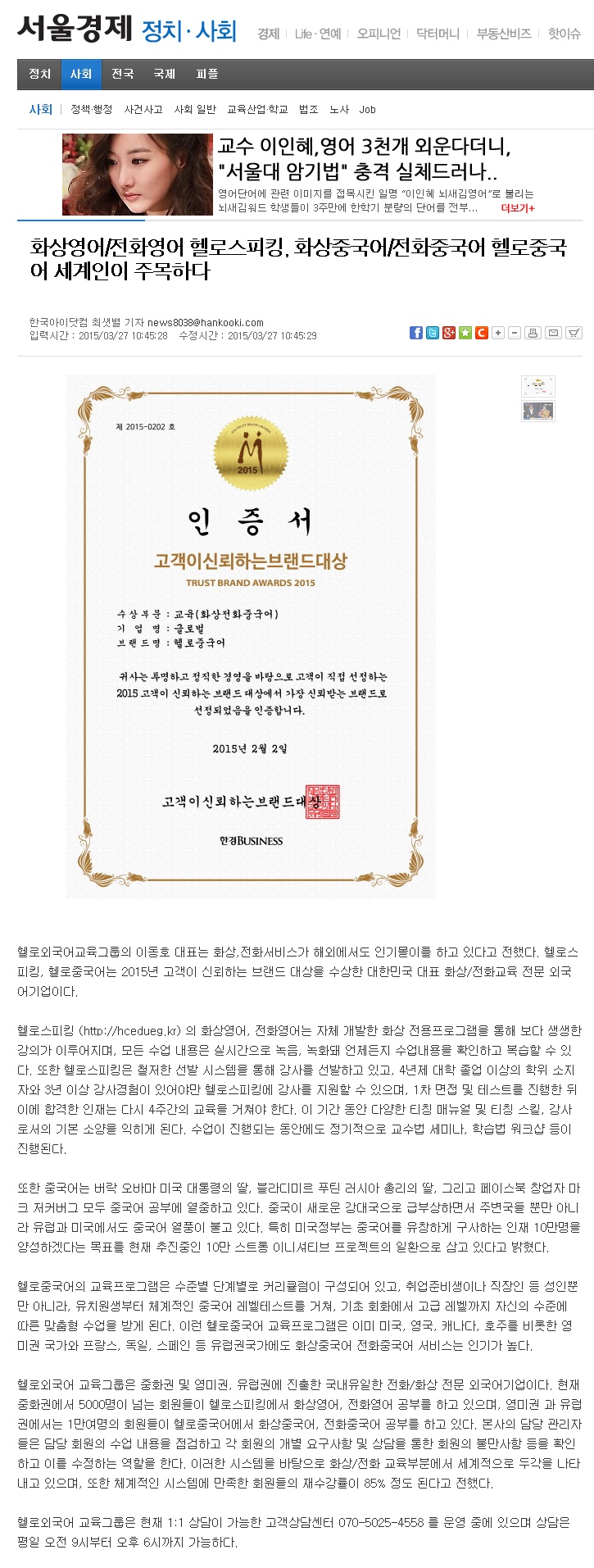 헬로외국어교육그룹이 신문에 났네요 ㅋㅋ